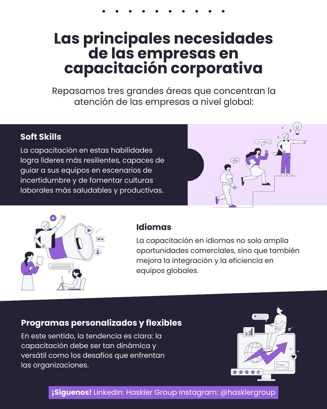 En Haskler Group diseñamos programas que integran estos tres ejes: desarrollo de soft skills, capacitación en idiomas y flexibilidad. Nuestro enfoque es práctico, personalizado y enfocado en resultados.
